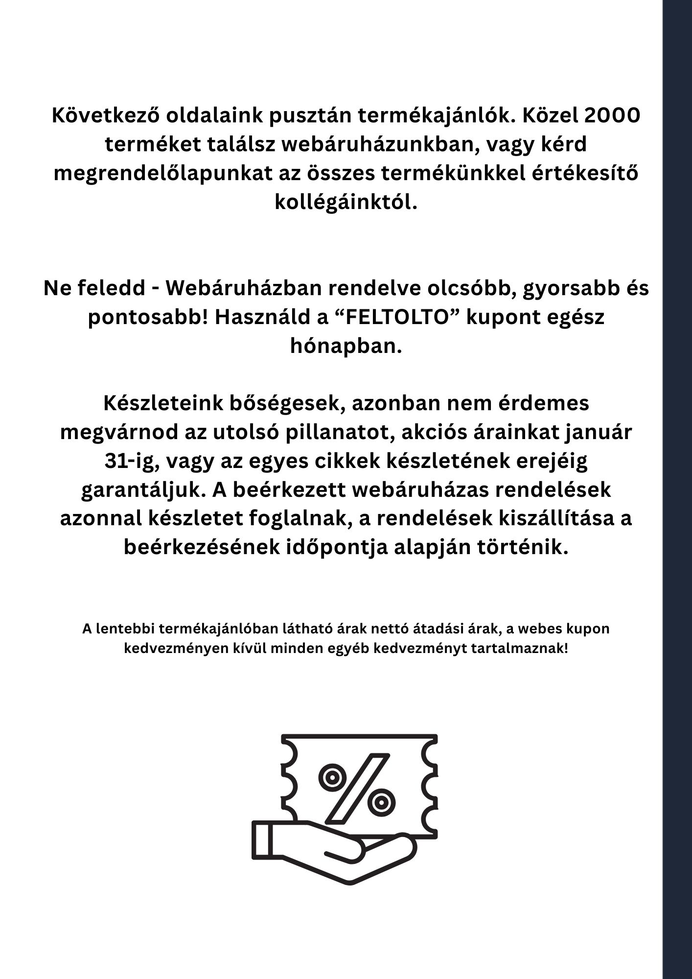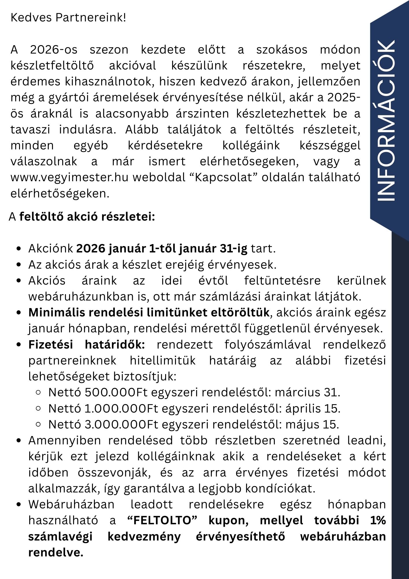 2026. január 5. Készletfeltöltés 2026 - indítsd velünk az évet! Lentebb láthatod a 2026-os készletfeltöltő akciónkat. A levél további részében minden hasznos információt megtalálsz. Amennyiben bármilyen egyéb kérdésed felmerülne, keress minket bizalommal. Vissza
