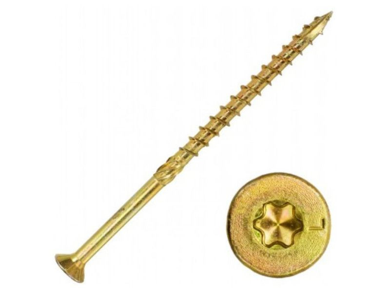 Faszerkezetekhez, tetőszerkezetekhez és ácsmunkákhoz fejlesztett, nagyszilárdságú konstrukciós csavar. A TX (Torx) meghajtás kevesebb megcsúszást jelent csavarbehajtáskor — gyorsabb, pontosabb munka. A süllyesztett fejes változat ott előnyös, ahol a csavar feje nem állhat ki a fa felszínéből (padló, deszkaburkolat). A lapos fejes változat nagyobb csavarási momentumot visz át, tehát teherhordó kötéseknél megbízhatóbb. A csavar önfúró fejű, nem repeszt, gyorsan halad az anyagban, előfúrni nem szükséges.